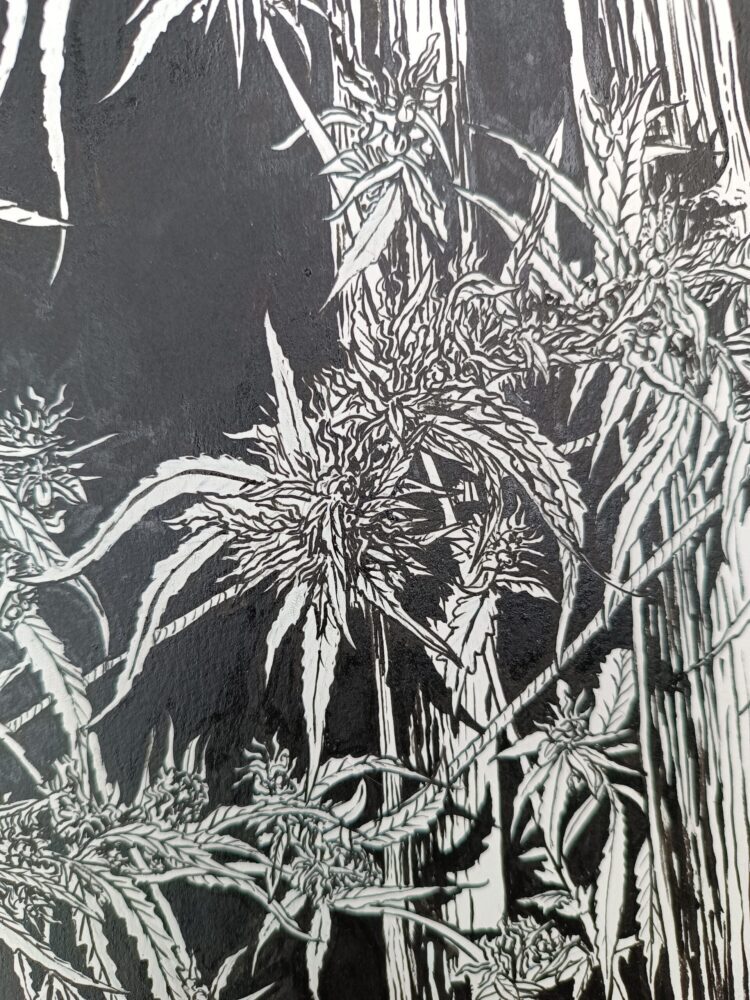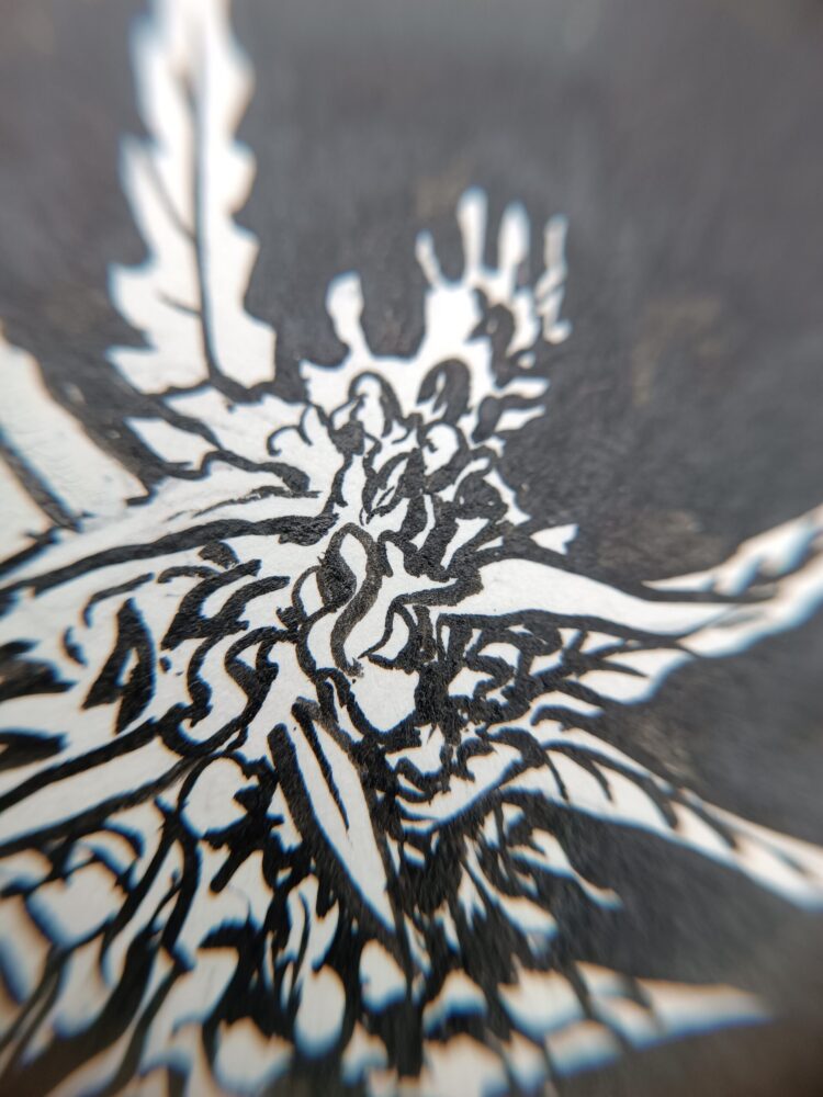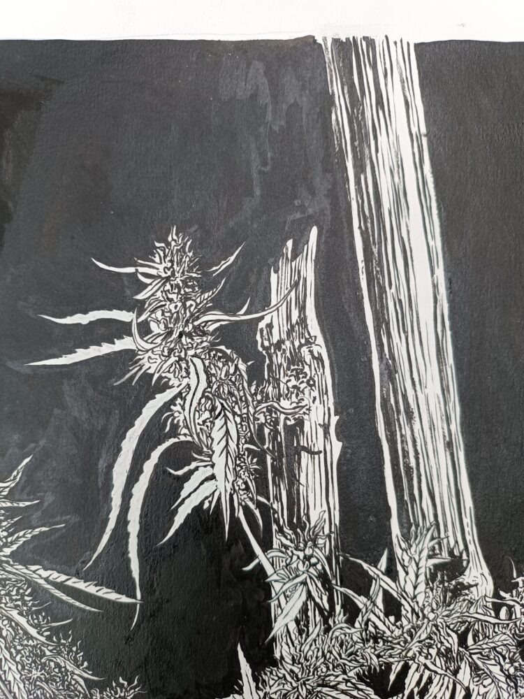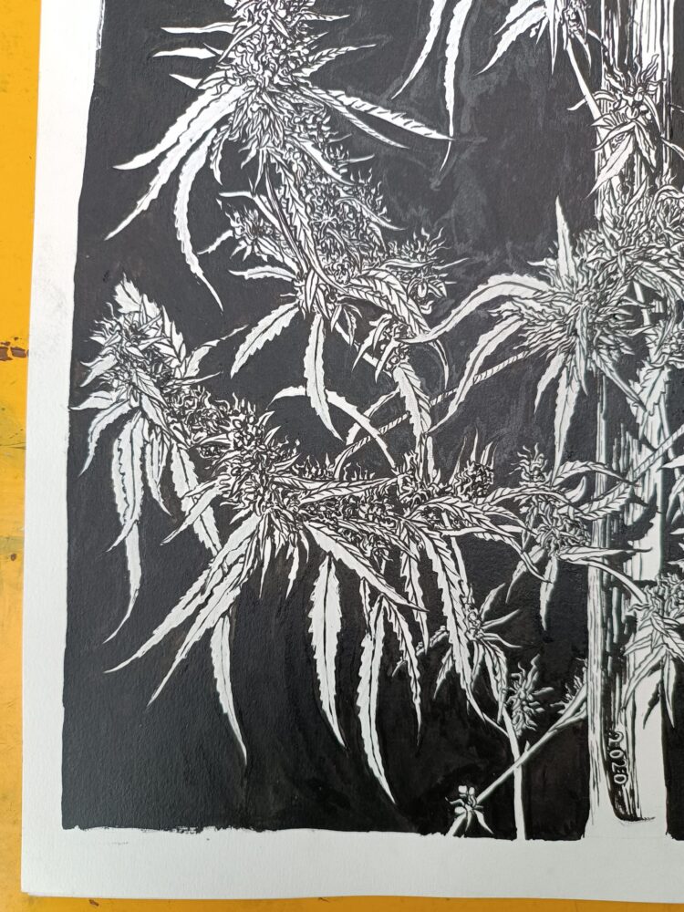 Trabalho original de 2020, feito com nankin e pincel sobre folha branca porosa, tamanho A3 (29,7 x 42 cm). Após isso o trabalho foi escaneado e foram feitas impressões digitais do mesmo desenho.