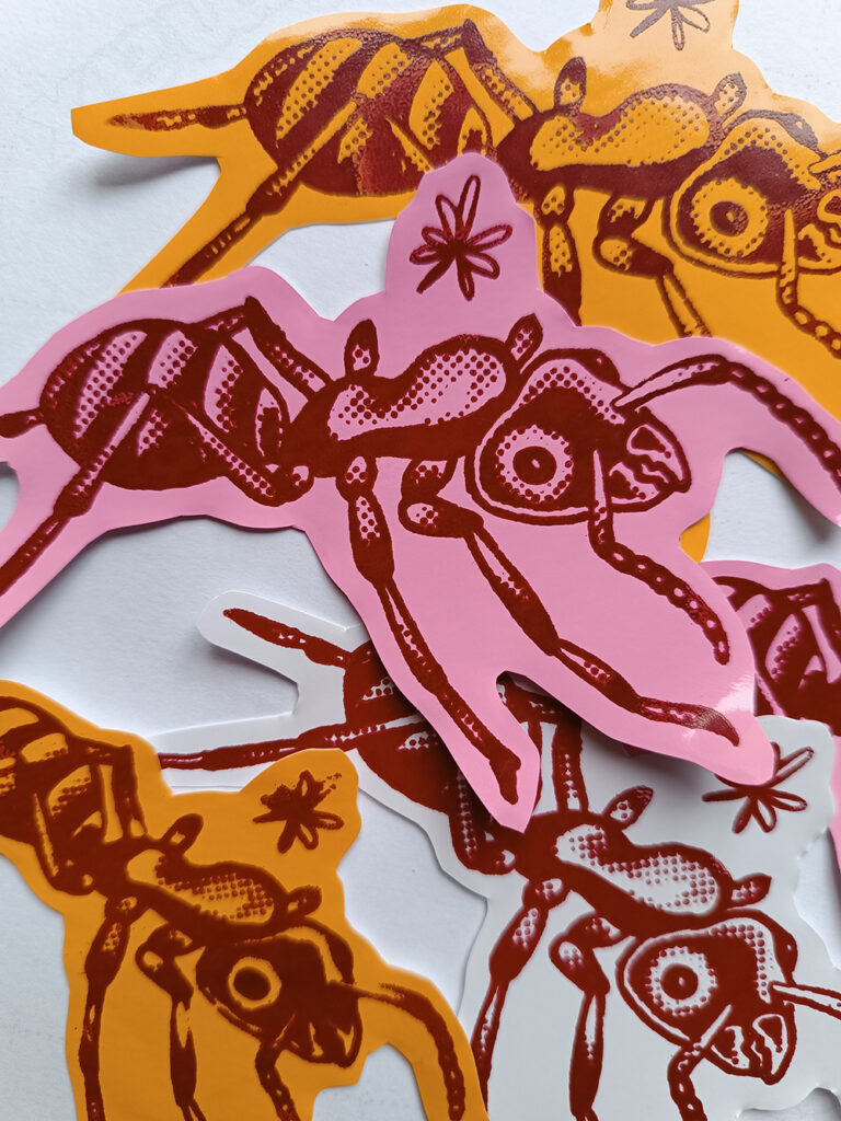 Temos nosso próprio atelier de serigrafia, onde nossa produção gráfica autoral ganha vida, e também fazemos algumas encomendas de parcerias.